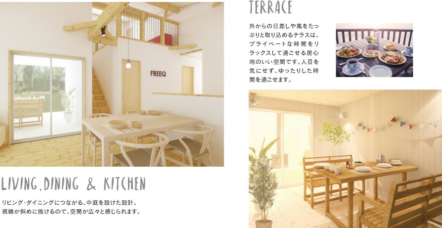 1階に中庭を設けた「テラスPOCHE」。天井と3方向の壁で囲まれているのでオープンになりすぎず、外の視線を上手に遮りながらリラックスできる空間です。外ごはんを食べたり、音楽を聞いたり、ガーデニングを楽しんだり。そんな大地とつながる暮らしができます。