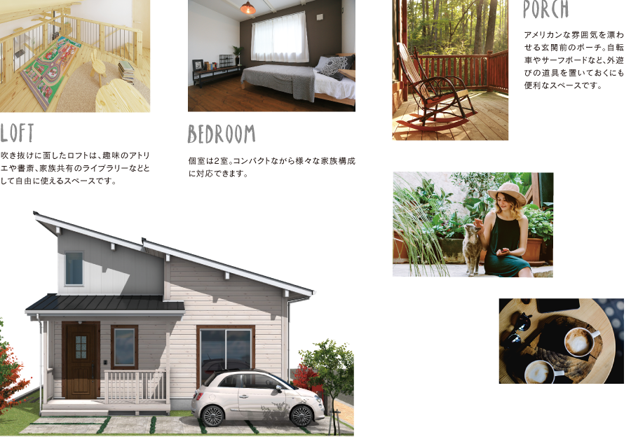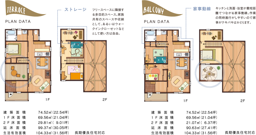 POCHEには、“幸せのポケット”を持つ、ふたつのプランがあります。ひとつは1階部分に大地につながるテラスを持ったテラスPOCHE。もうひとつは2階にプライベートな空間を持つ、バルコニーPOCHEです。大地と空、理想とする暮らし方に合わせて選んでいただくことができます。