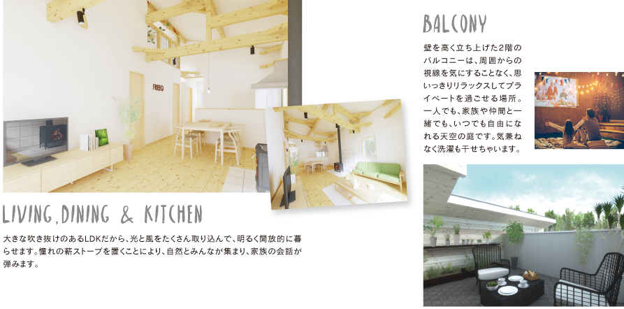 2階に開放的なバルコニーを設けた「バルコニーPOCHE」。壁が高いので外の視線を遮りながらリラックスできます。昼はチェアに座って読書をしたり、夜は星空の下で映画やお酒を楽しんだり、天体観測をしたり。そんな空とつながる暮らしができます。